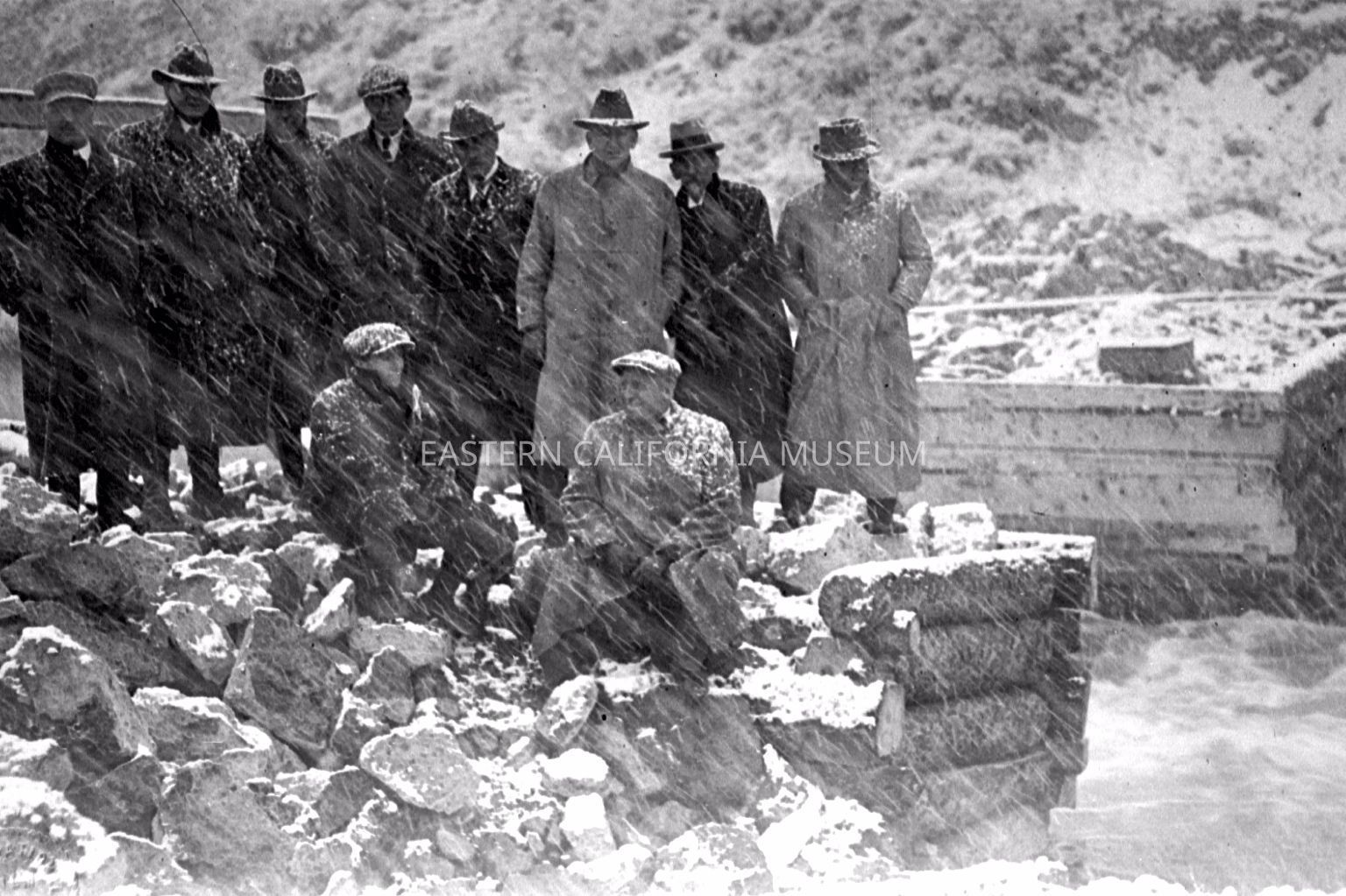 B & W digital scan of LA Aqueduct officials (Head Honcho's) Looking over Aqueduct during Snow Storm. Fourth man from right (upper row) looks suspiciously like William Mulholland.Collection