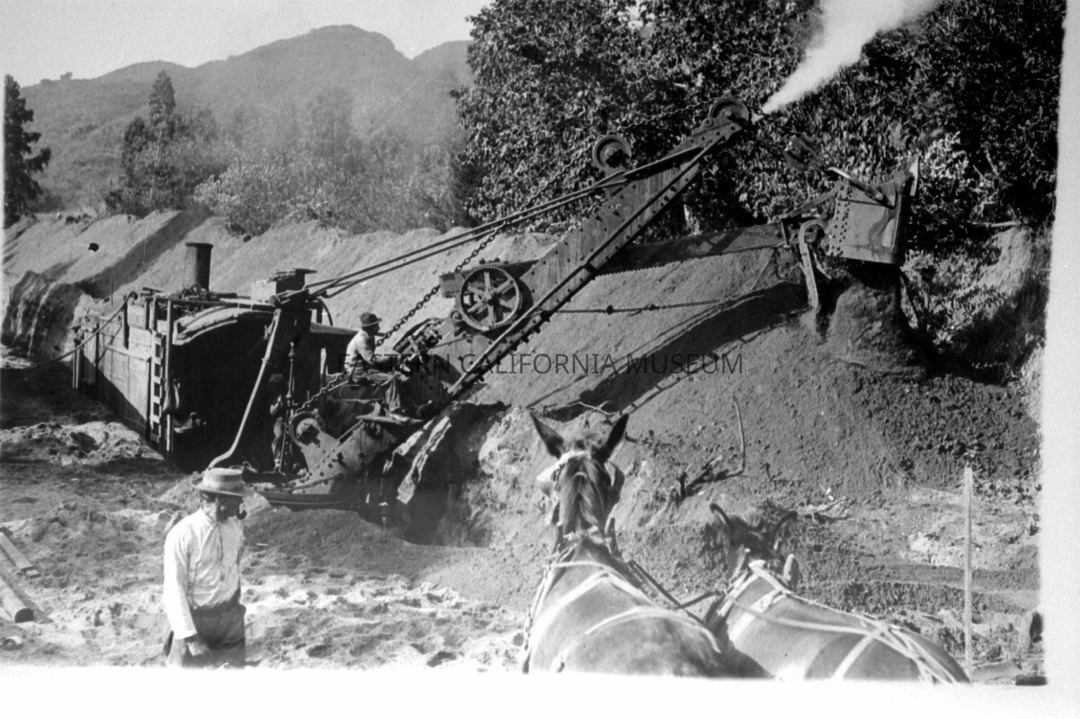 B & W digital scan of LADWP Steam Shovel and Crew in action excavating trench on LA Aqueduct Project. Laborer sitting near boom may be controlling bucket? as mules look on. Note; man in trench barely visible below boom. "All excavations of the 430 second-foot condduits was made with Model 40 Marion steam Shovels, carrying 3/4 yeard dippers and booms 25 feet in length. The normal width of excavation was 12 1/2 feet and the normal depth 10 1/2 feet. It was found desirable to waste all the excavated material on one side of the ditch where possible, so as to leave the other side clear for the handling of materials for the lining." - from LA Aqueduct Construction, Final Report, 1916 pg. 173Collection