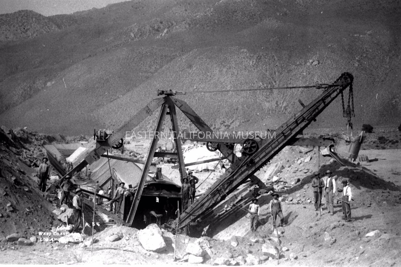 B & W digital scan showing the progression of constructiing an Open, Lined Section of LA Aqueduct. Image pictures Steam Shovel excavating canal followed up by concrete lining crew. Location likely in Cottonwood / Olancha area (Olancha Division of LA Aqueduct.) Laborers armed with shovels and picks. "Concreting was carried on immediately behine the shovels."Collection