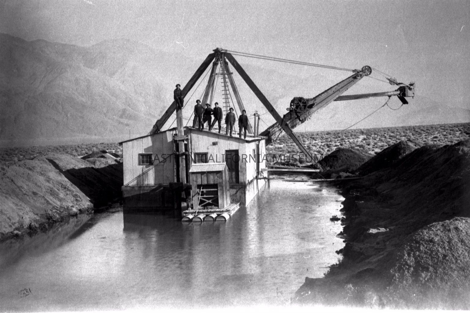 "The excavation was done by floating dredges. Dredge 1 worked south from Black Rock Springs until it struck a heavy like or travertine deposit opposite Sawmill Creek. A dipper dredge was used to complete this section. It proved so efficient in its operation that it was decided to complete the canal with this dredge." -- from LA Aqueduct Construction, Final Report, 1916 pg. 159Collection