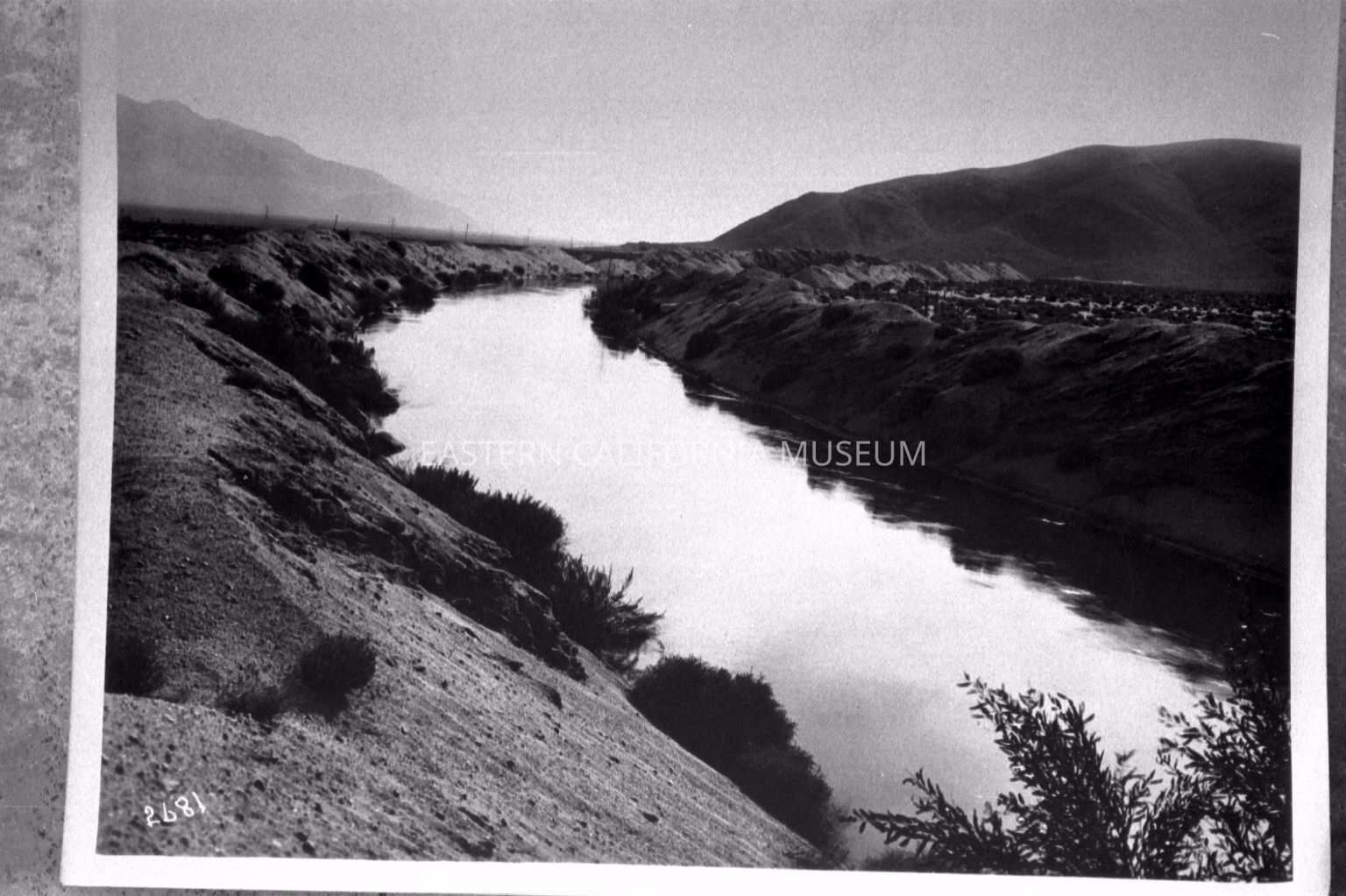 B & W digital scan of Open, Unlined Section of Los Angeles Aqueduct full of water. Unlined Section terminated at north end of the Alabama Hills, where the soil, of a much more porous nature necessitated lining the aqueduct canal. Location near Manzanar or just south. Looking south toward Alabama Hills visible on right side of image, Inyo Mountains to the left.Collection