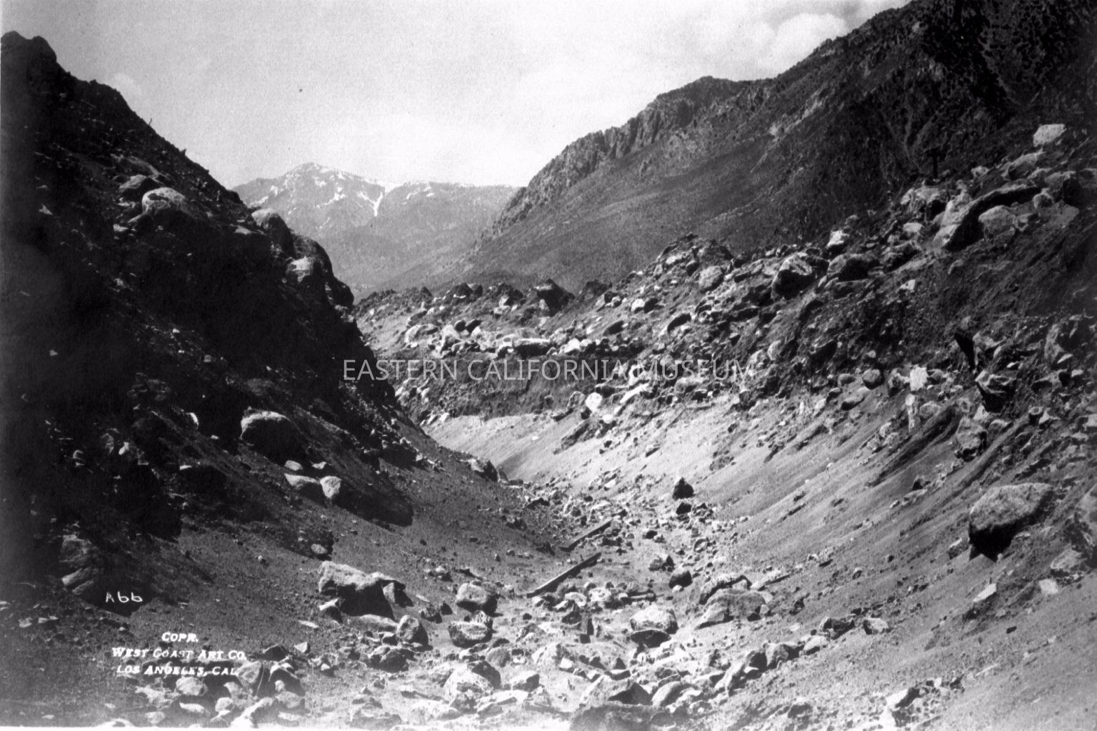 B & W digital scan of excavation by Aqueduct Steam Shovel that, in time, will become the Open Lined Section of LA Aqueduct, location north of Olancha. Olancha Peak may be snow-covered peak in distance. "The ancient beach line of Owens Lake is closely followed by the constructed ditch. The lake, at the time this beach line was formed stood at an elevation of 3,790 feet or 220 feet above the present lake level. Although this was advantageous to the construction in providing an ample supply of clean, well-graded beach gravels for concrete, in close proximity to the work, it operated against it in that the excavation was carried through the detrital fans of the tributary canyons. --from LA Aqueduct Construction, Final Report, 1916 pg 151Collection