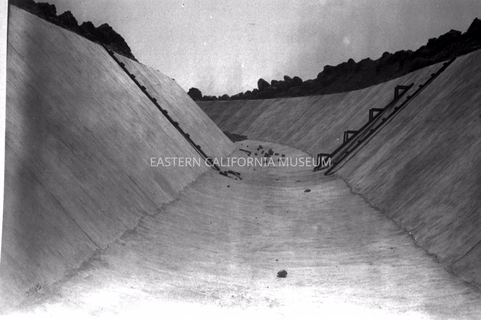 B & W digital scan showing the concrete lining completed on the Open, Lined section of LA Aqueduct. Wooden steps and ladders to access canal still in place. Small fragments of excavated earth seeking their lowest level appear as black blobs on the bottom of the canal.Collection