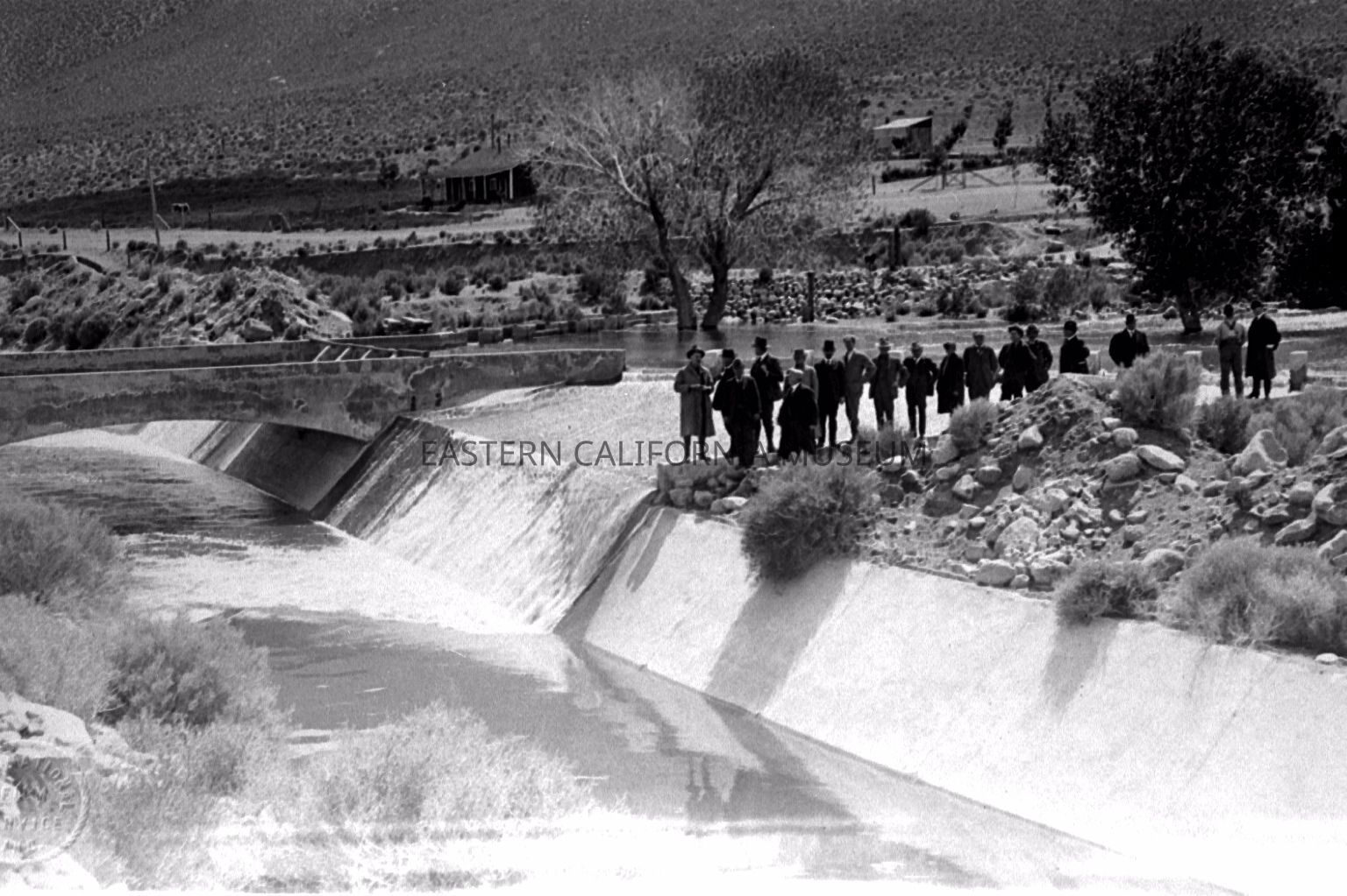 B & W digital scan of "Aqueduct Tourists" possibly dignitaries at the junction of the Cottonwood Creek Flume and the Open, Lined section of the LA Aqueduct. A number of field trips were arranged by William Mulholland for water and city officials curious or even skeptical about the progress made on the Aqueduct and what 24 million dollars was buying? Location, is just south of Cottonwood Creek Power PlantCollection
