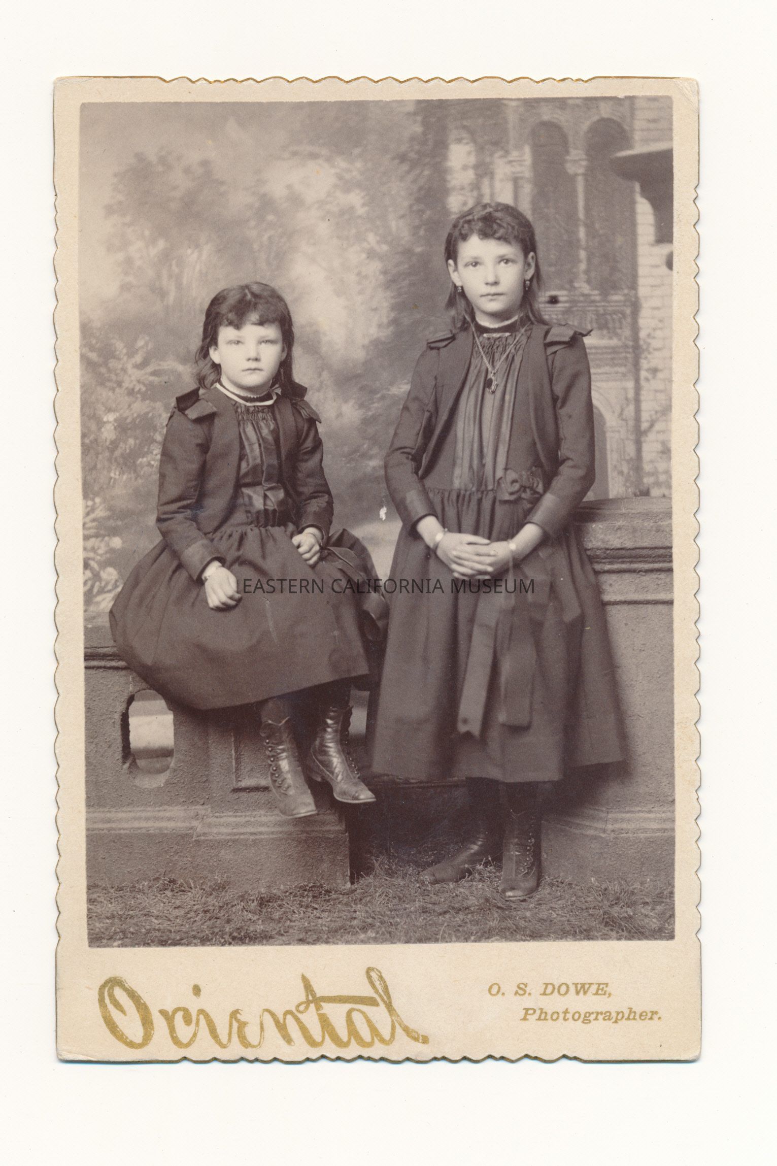 Mounted full length studio portrait of Daisy Moore and Hattie Moore as young girls. Photographer was O. S. Dowe of the Oriental Studio.Collection