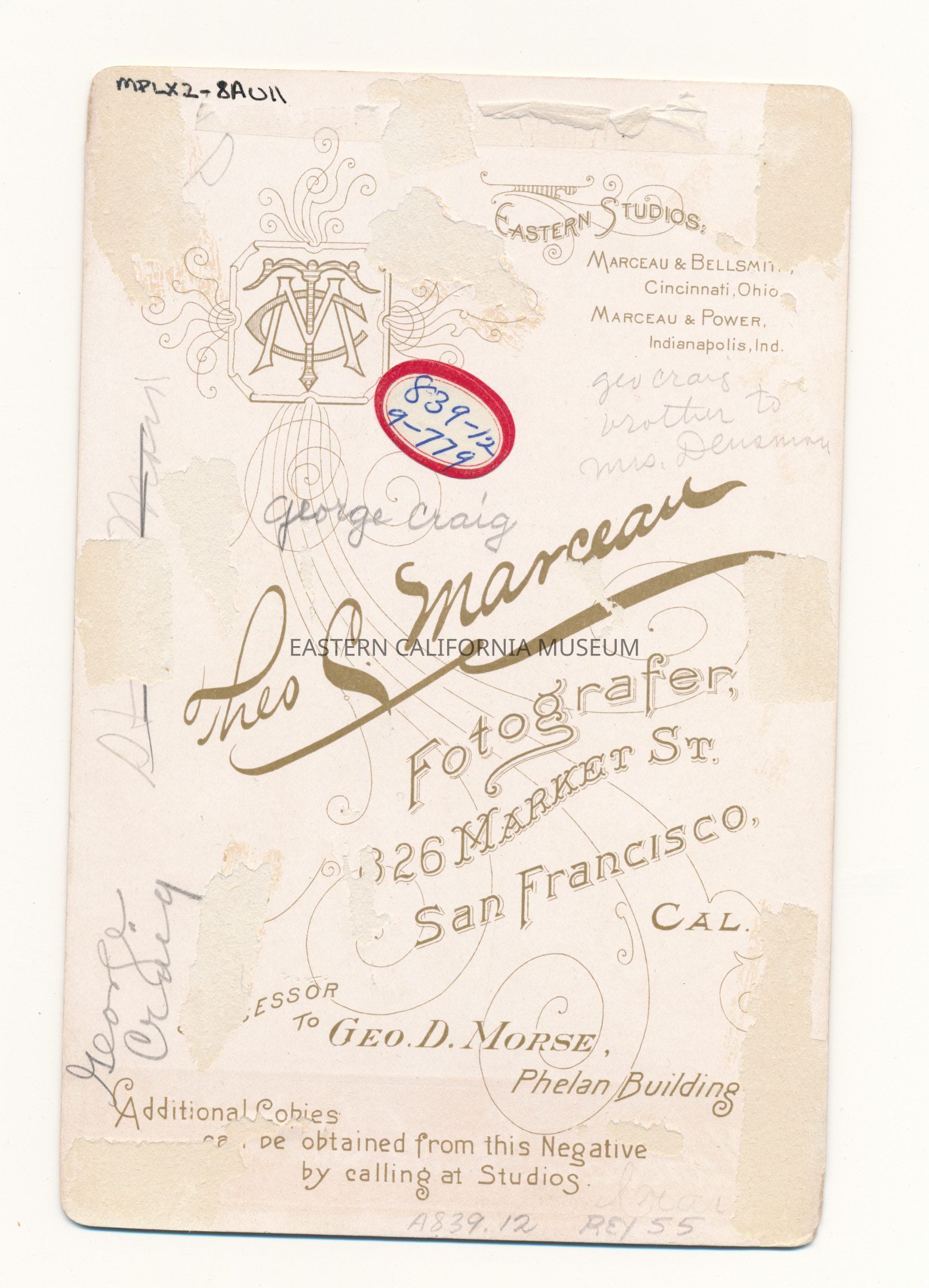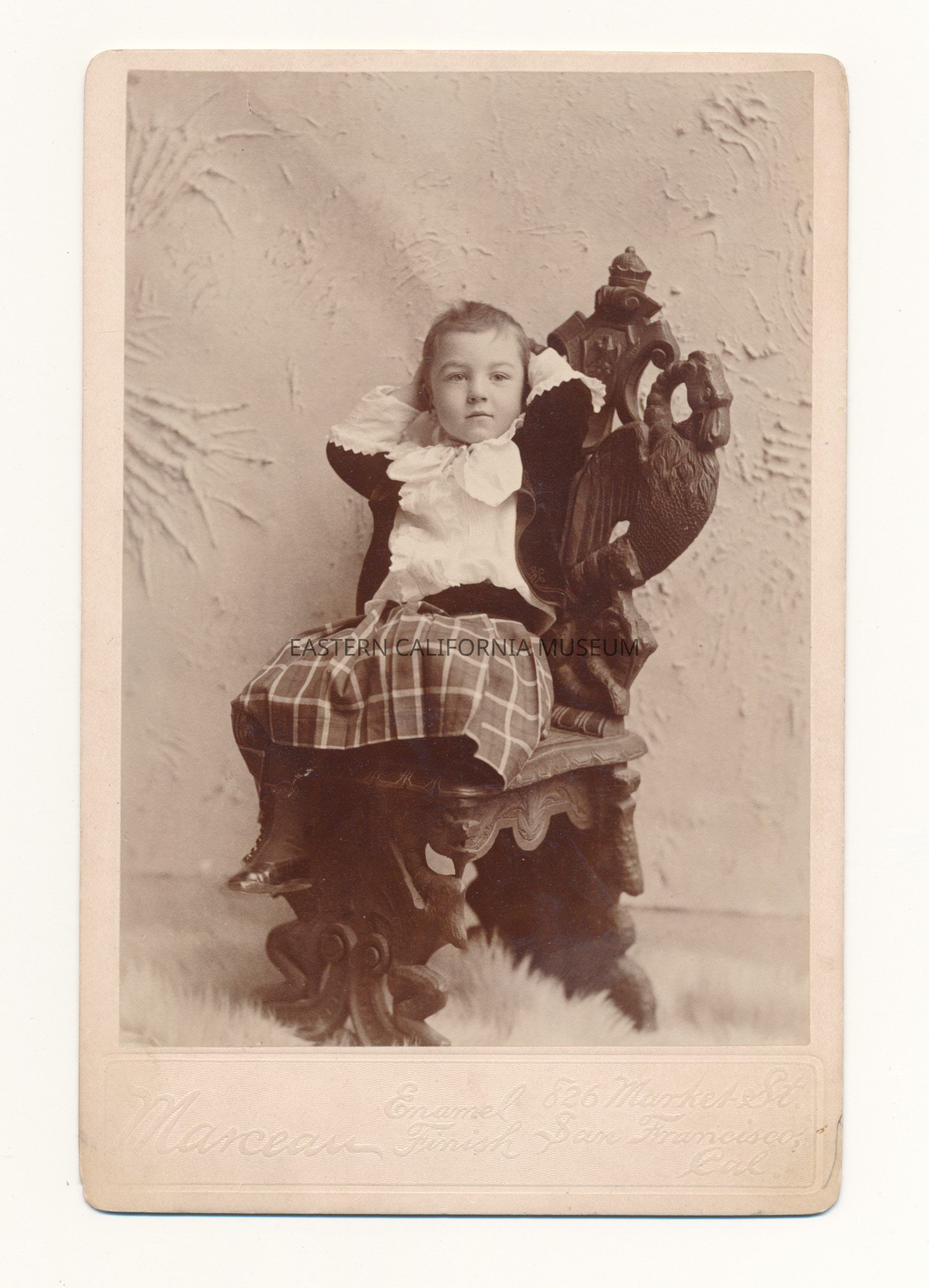 Mounted studio portrait of George Craig as a little boy. The photographer was Theo. C. Marceau of San Francisco. The mount also says "Enamel Finish." The Craig family lived in Independence and in the 1880s Mr. Craig published the Inyo Index newspaper.