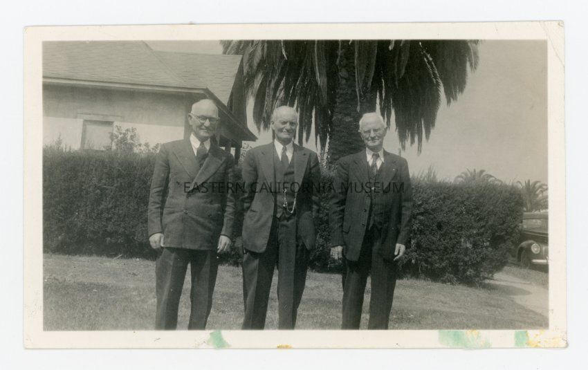 Photo of three older men in suits standing in front of a house, hedge, and palm tree. Vehicle visible to right.