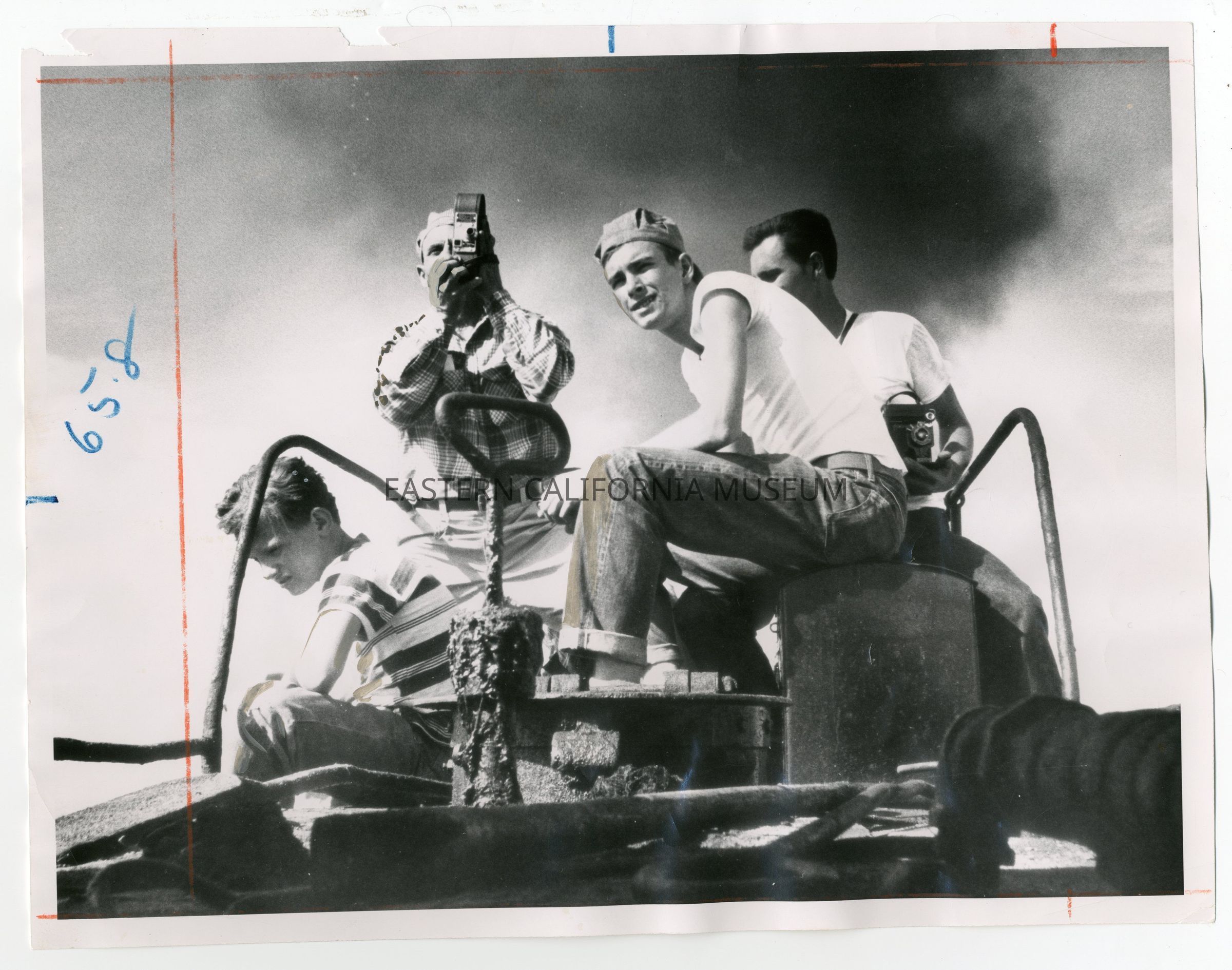 Oversize photo of four railfans on the last run of Southern Pacific narrow gauge steam locomotives, October 1954. Marks in red and blue (editing guides?) on front of photo.