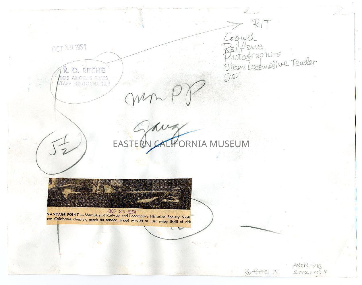 Newspaper clipping affixed to reverse from the LA Times, Oct. 25, 1954: Vantage point. Members of Railway and Locomotive Historical Society, Southern California chapter, perch on tender, shoot movies or just enjoy thrill of ride.