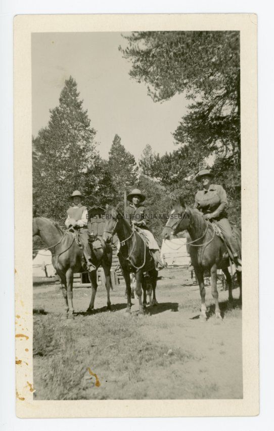 Photo of three people on horseback. Two of them are identified on the reverse as Amelia Johnson and Mrs. Bev [Beveridge] Hunter (nee Ruth Willis?). Photographer was Hammond's Studio of Porterville, CA.Collection