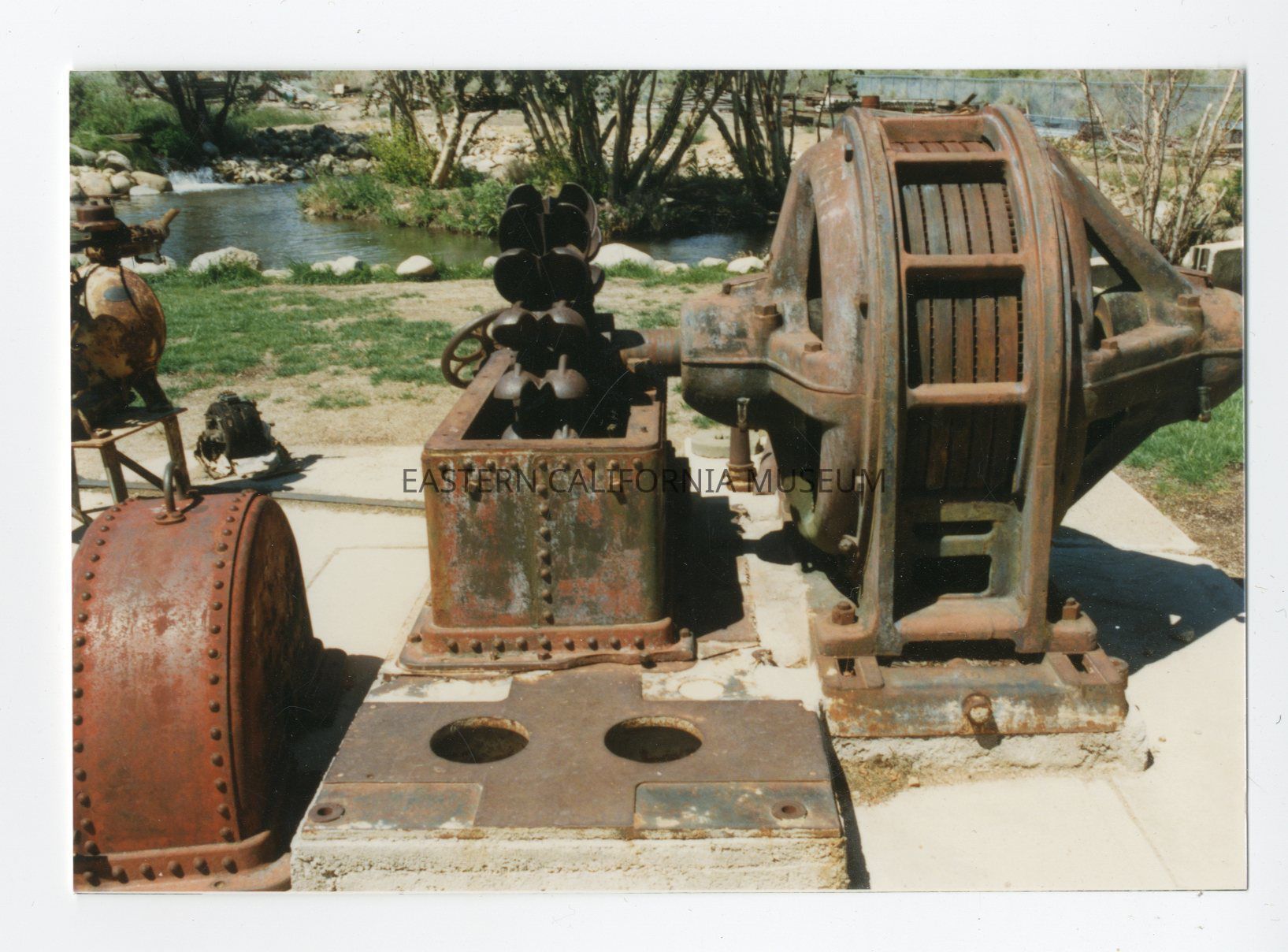 Nos. 2-8, 2-9, 2-10, 2-11. Pelton Wheel originally installed in the DWP's Division Creek Power Plant No. 1. It is not connected to the original generator. Division Creek supplied power to the electric-powered dredge that the DWP used to dig the aqueduct. Later, Division Creek power was delivered to the area which began the generation of power in Owens Valley.
