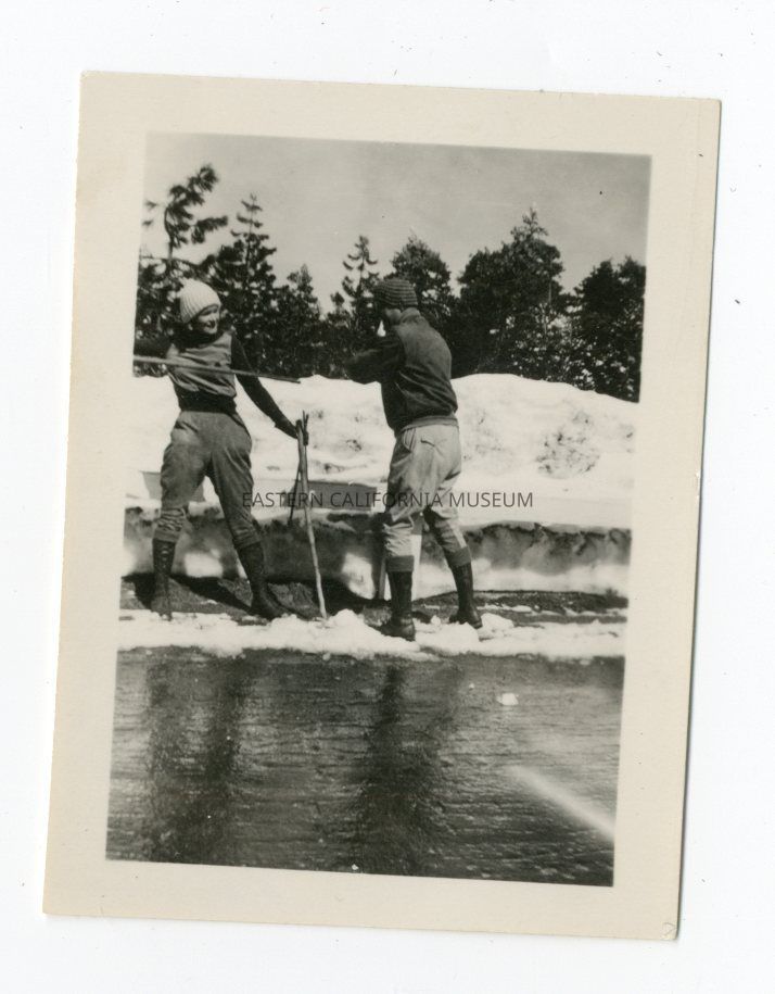 Photo of a man and a woman hiking alongside a snowbank that is up to their knees. They are walking on a paved road. She is holding two walking sticks. Location unknown.