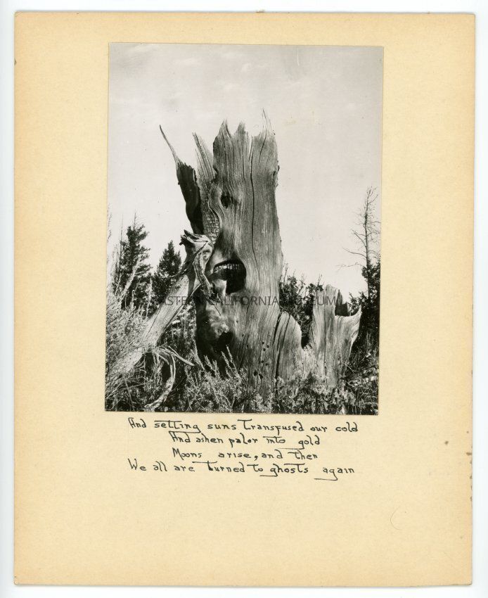 Mounted photo of a tree stump with a poem written beneath it: And setting suns transfiused out cold And ashen palor into gold Moons arise, and then We all are turned to ghosts again