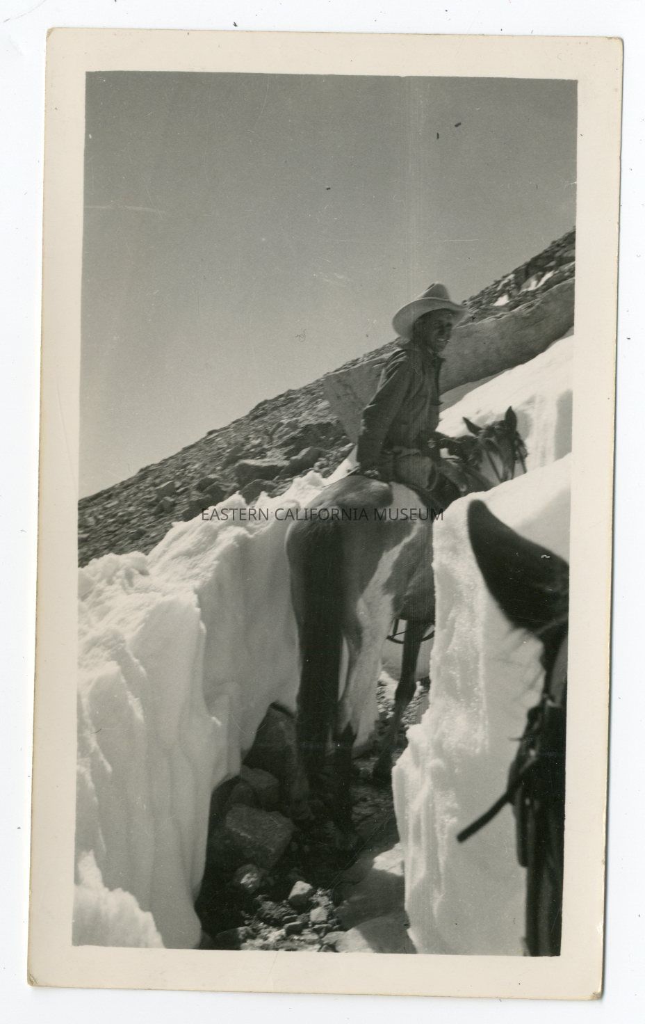 Photo of a man on horseback navigating through a narrow trail with snow as high as his horse's back on both sides. Written in blue ink on reverse: Buck Hyers.