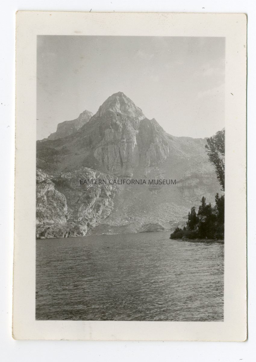 Photo of a single mountain peak with a lake in the foreground. Location unknown. Stamped in blue ink on reverse: [illegible logo] 10 3 1934.