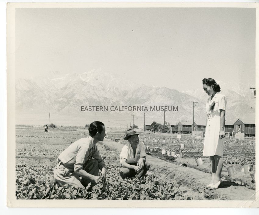 B&W. Manzanar War Relocation Center, photo of young Japanese girl speaking and smiling with two men in fields or gardens. Barracks in background.