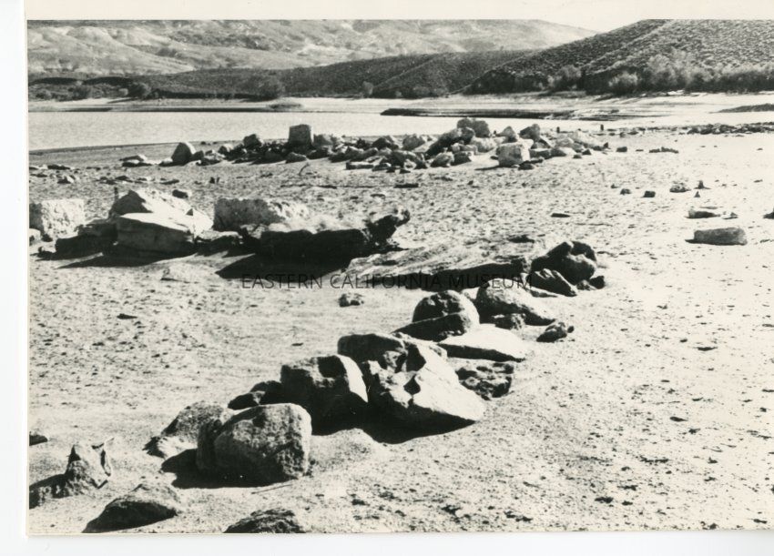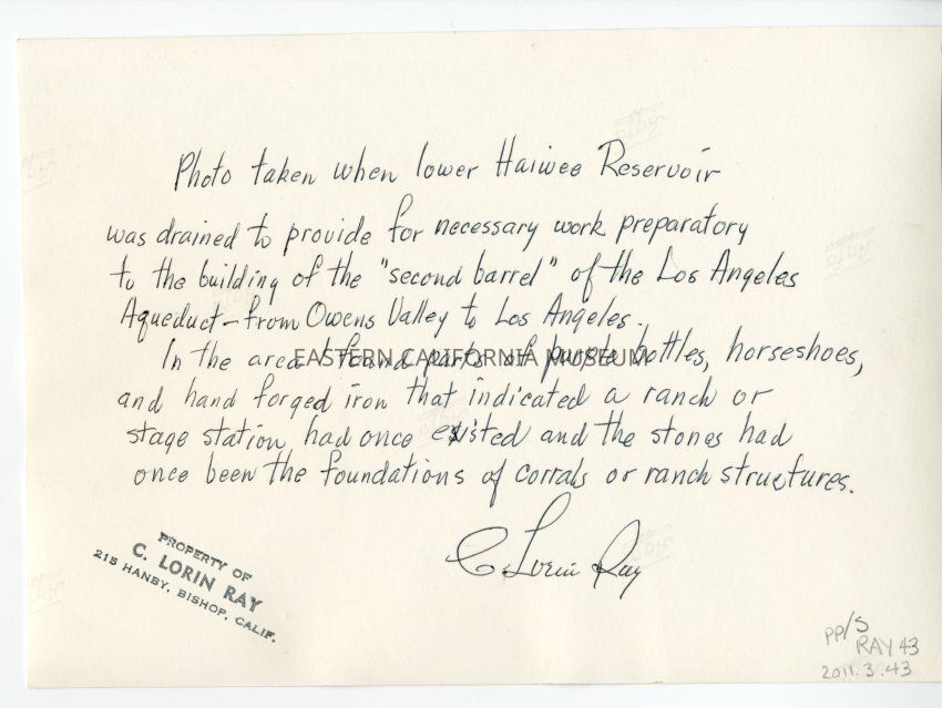 Reverse: Handwritten in ink: Photo taken when lower Haiwee Reservoir was drained to provide for necessary work preparatory to the building of the "second barrel" of the Los Angeles Aqueduct--from Owens Valley to Los Angeles. In the area I found parts of purple bottles, horseshoes, and hand forged iron that indicated a ranch or stage station had once existed and the stones had once been the foundations of corrals or ranch structures. C. Lorin RayCollection