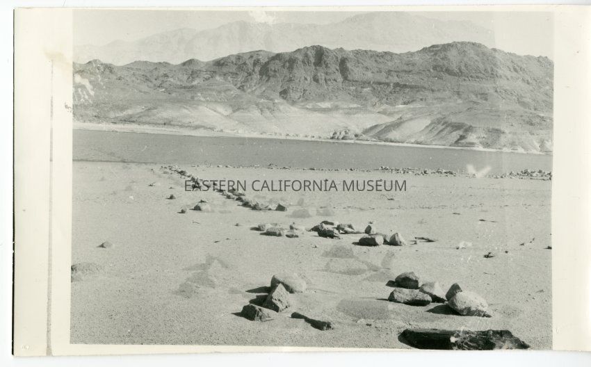 B&W. Haiwee Reservoir as it was drained during construction of the second aqueduct (1965-1970). Line of rocks in the foreground, appears to have been man-made groupings.