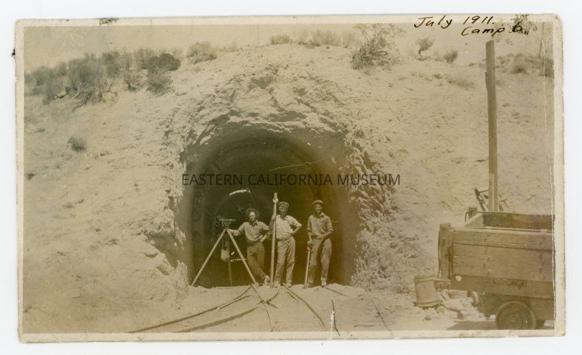 Photo of three members of a survey team at the entrance of an unidentified tunnel on the L.A. Aqueduct Project in July 1911. Location, judging from the shape of the tunnel, may be in the Grapevine or Antelope Divisions.
