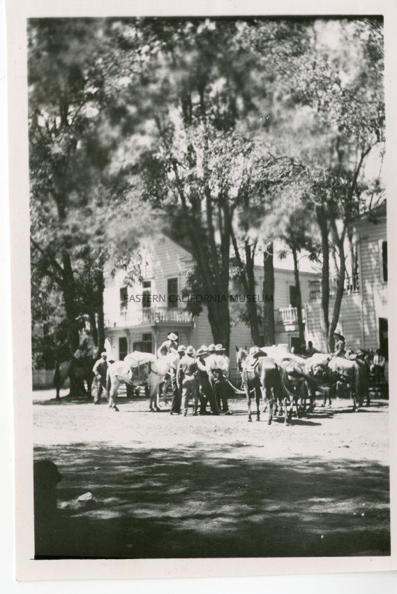 B&W. Photo of a street scene. Two story buildings in background, group of men and packed horses in front. Tall trees giving lots of shade. Maybe the Butler Hotel in Big Pine?Collection