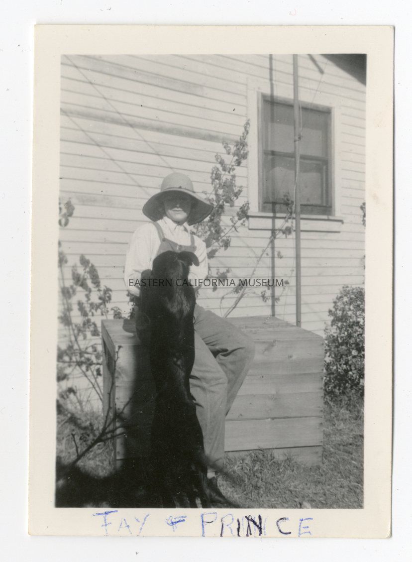 Photo of a woman outside a house with a black dog. Written in blue ink along bottom edge is "Fay + Prince."