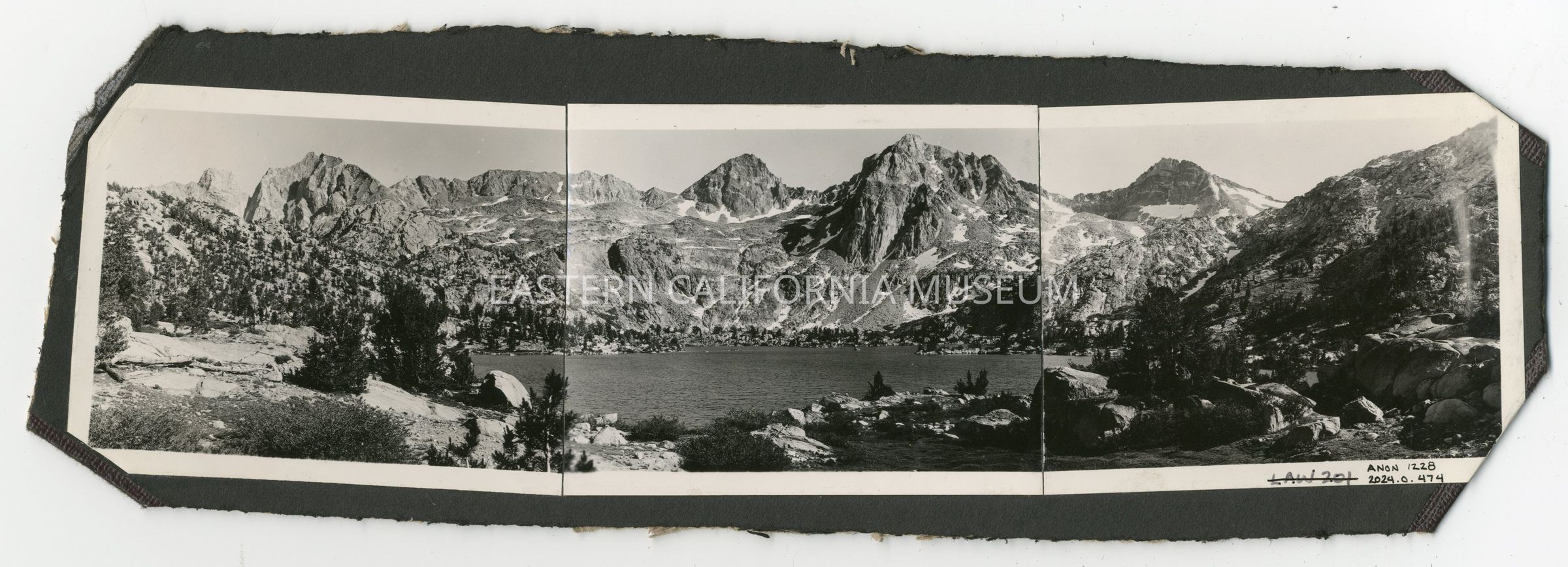 Panorama photo consisting of three photos placed side by side of a lake surrounded by rocky mountains. They are affixed to the back cover of a photo album, which has been cut down. Location unknown.