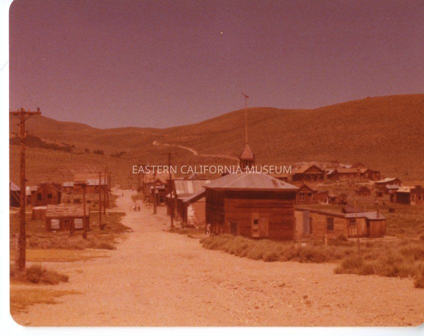 Color. Photo of what appears to be a ghost town (Bodie?) with dirt street, hills in background, twlephone poles, and numerous old wood buildings. Same location as RAY 59, RAY 60, and RAY 61. One building in center has something similiar to a steeple and weathervane. Found in envelope labeled "Lone Pine."Collection