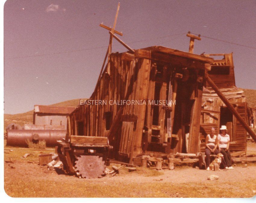 Color. Same location as RAY 58, RAY 59, and RAY 60. Appears to be a ghost town with abandoned buildings. This photo is of a building with two people and a dog in front, also present: a round saw, pipe, and telephone. Found in envelope labeled, "Lone Pine."Collection