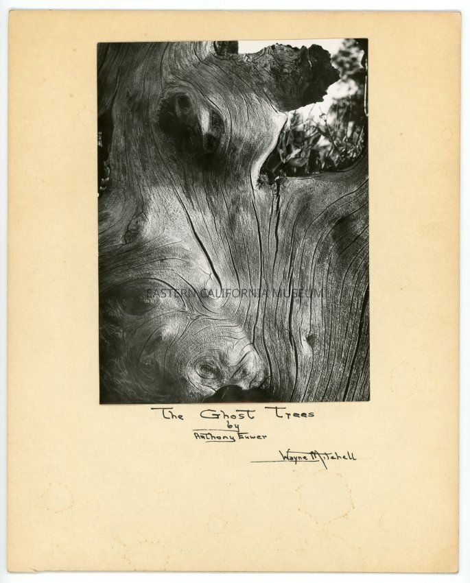Mounted close up photo of the texture of tree bark with the following written beneath it: The Ghost Trees, by Anthony Euwer. Wayne Mitchell [artist?].