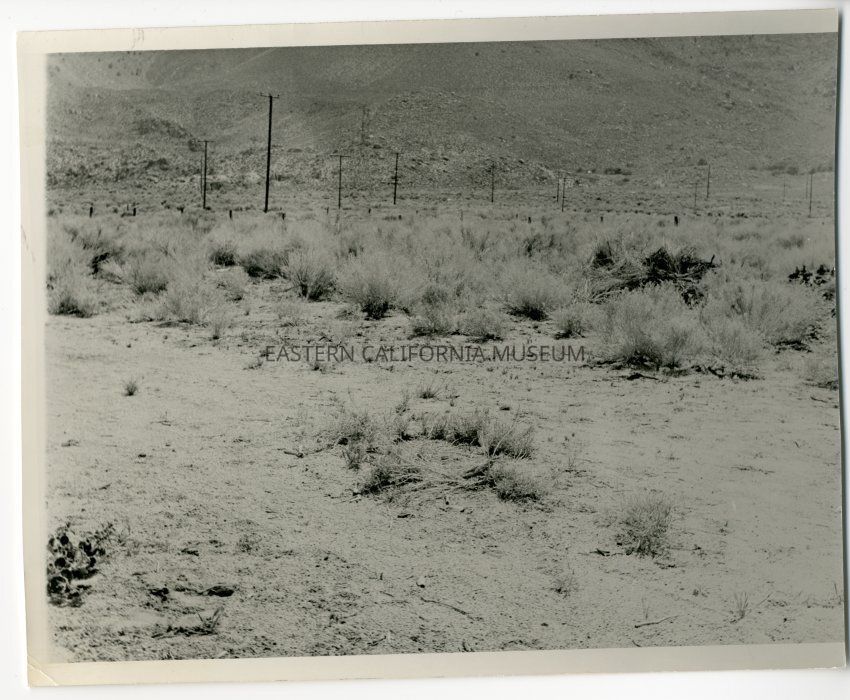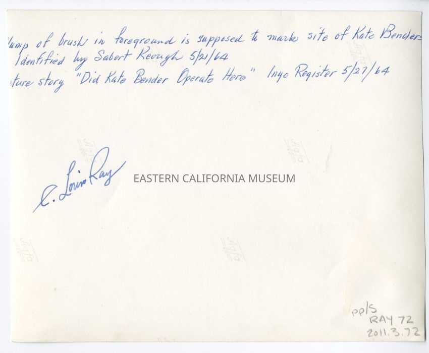 Reverse: Handwritten in blue ink: Clump of brush in foreground is supposed to mark site of Kate Benders. Identified by Sabert Keough 5/21/64. Feature story, "Did Kate Bender Operate Here" Inyo Register 5/27/64Collection