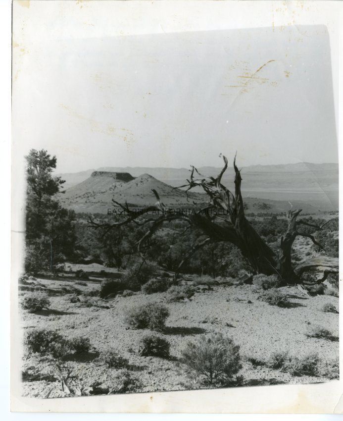B&W. Photo from higher elevation looking down at bristlecone pine tree, sagebrush, valley floor, distictive shaped mountain or volcano in middle distance. Same location as RAY 83.