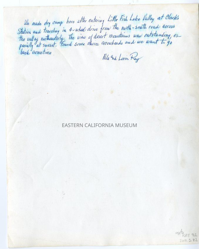 Reverse: Handwritten in blue ink: We made dry camp here after entering Little Fish Lake Valley at Clark's Station and traveling in 4-wheel drive from the north-south road across the valley northeasterly. The view of desert mountains was outstanding, especially at sunset. Found some choice arrowheads and we want to go back sometime. Nila and Lorin Ray.Collection