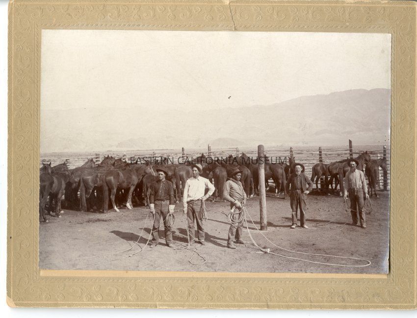Mounted photo of five cowboys with ropes, gloves, and hats in a corral with horses near Independence. Inyo Mountains in the background.