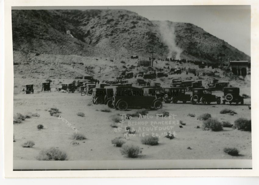 B&W. Large grouping of cars at the Alabama Spillway during the events of November 16-20, 1924. Smoke or steam rising in background. Photo is captioned on front as, "The Auto Fleet of Bishp Ranchers at LA Aqueduct, Nov 16-20, 1924." Also the name "Detrick" is written on the front of the photo.
