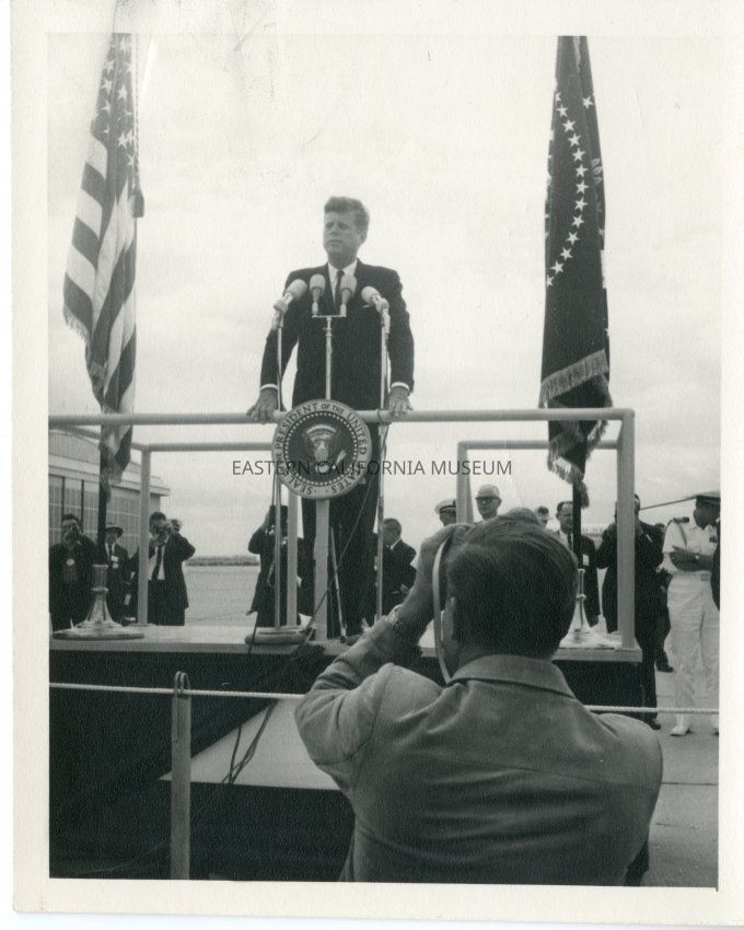 B&W. President John F. Kennedy stading on a stage making an address at China Lake. Photographer in foreground, two flags, people, buildings in background.