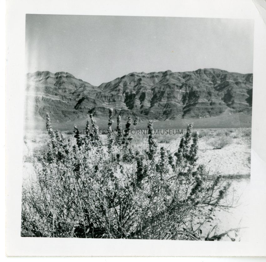 B&W. Last Chance Range with its distinctive stripes as seen from Eureka Valley near the sand dunes. Large shrub in foreground.