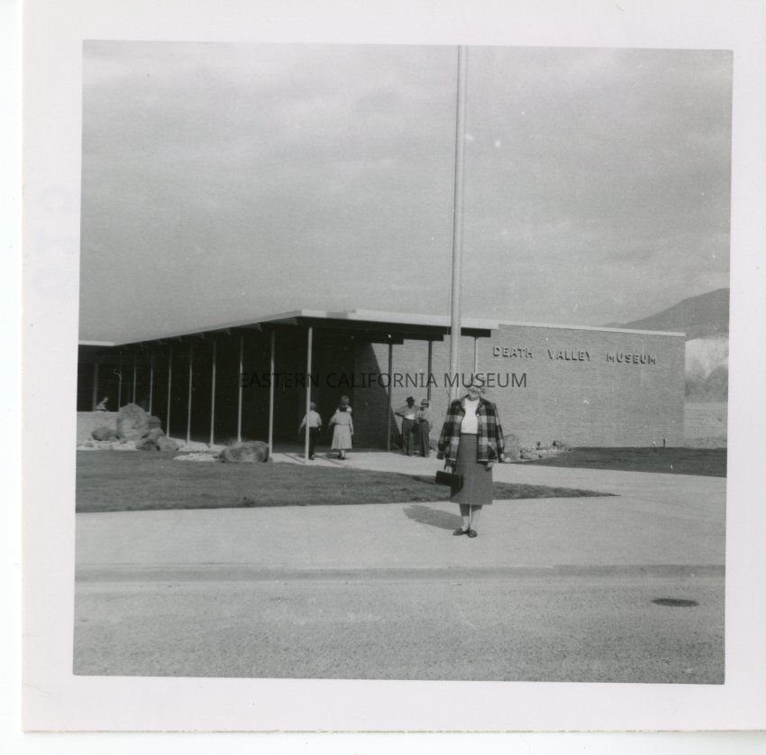 B&W. Nila Ray standing in front of the Death Valley Museum on dedication day, November 13, 1960.