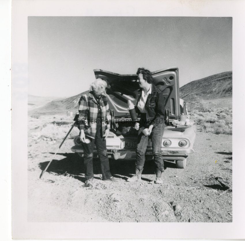 B&W. Nila Ray and Gwen Greuell (sp?) standing in front of the open trunk of a car in the middle of the desert. Looks like a lunch stop because Gwen is holding a thermos.