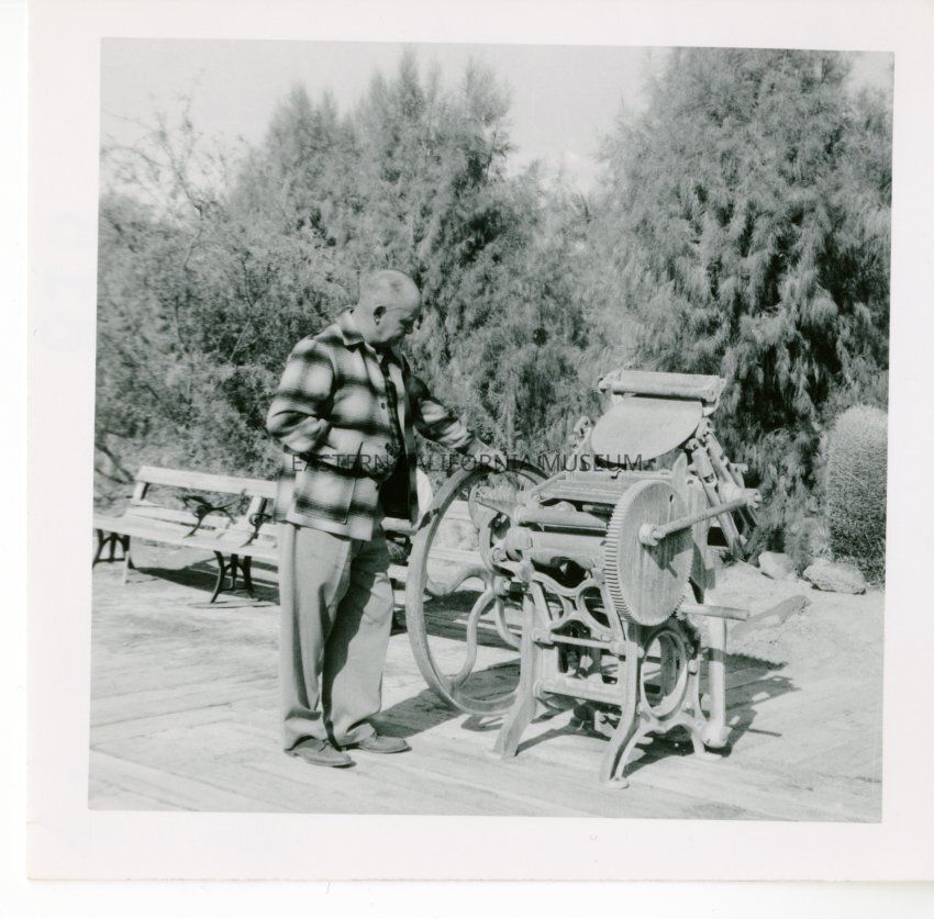 B&W. C. Lorin Ray (I think) standing next to a large, complex looking machine.