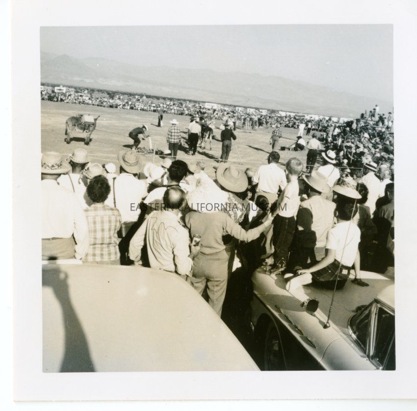 Sepia. Large gathering of people around a dirt arena. Cars, trucks, vehicles, people of all ages, appears to be mules and campfires in the arena. Part of the Death Valley 49er Celebration.