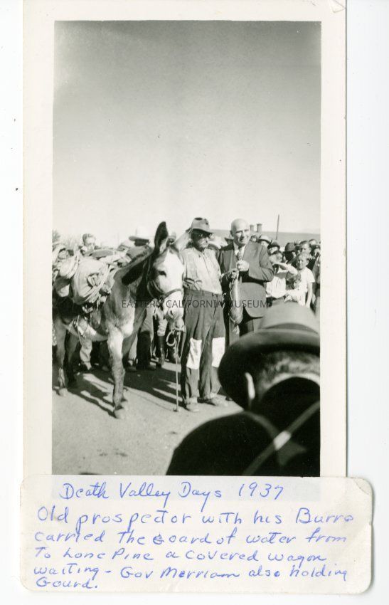 B&W. Burro, two men holding gourd, crowd of people behind them, back of man in foreground. Sticky note label reads, "Death Valley Days 1937. Old prospector with his burro carried the gourd of water from to Lone Pine a covered wagon waiting--Gov Merriam also holding gourd.
