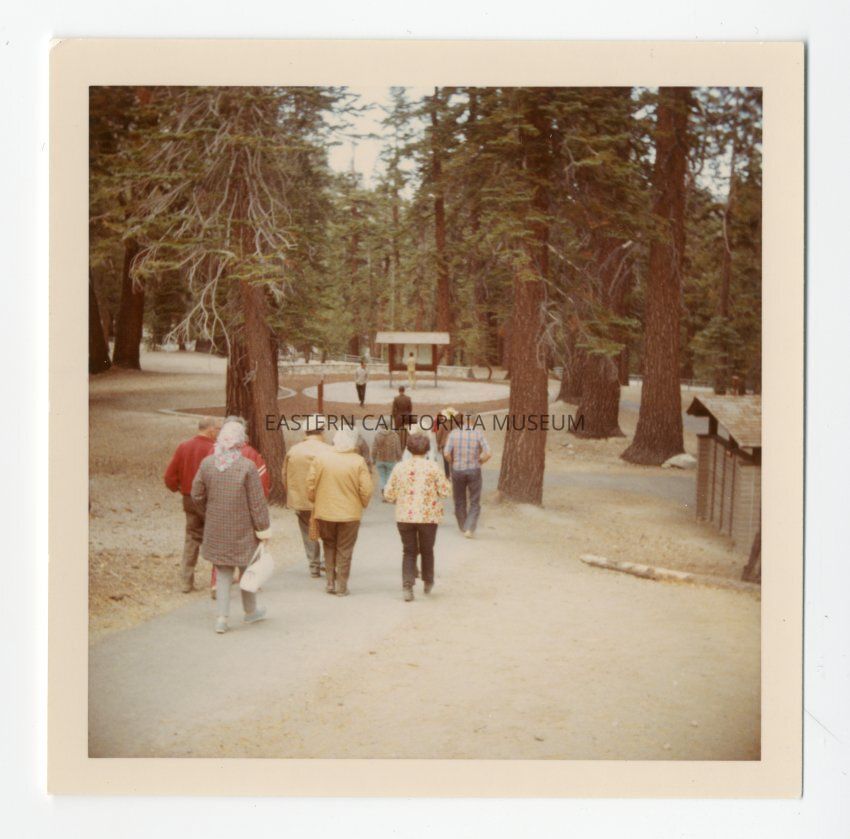 Small color photo taken during a museum field trip in September 1968 to the Mammoth Lakes area to see the glass flow, Inyo Craters, Minaret overlook, and the earthquake fault. This photo is of a group of people walking towards an informational kiosk.Collection