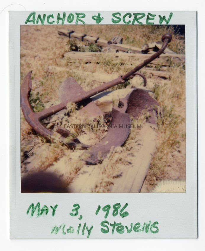 Color Polaroid of an anchor and propeller screw allegedly from the Molly Stevens ship that operated on Owens Lake.