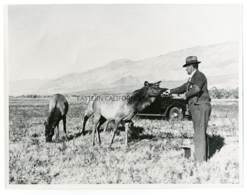 Photo of G. Walter Dow feeding tule elk in the Tinnemaha area. A vehicle is parked behind them.