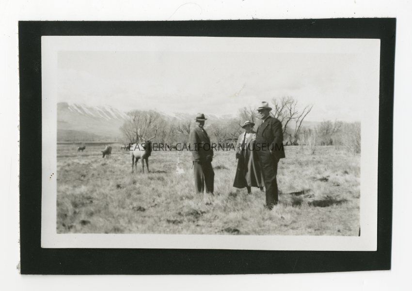 Photo of three people (two men and a woman, likely Walter Dow and Maude Dow) standing in a field with tule elk in the Tinnemaha area.
