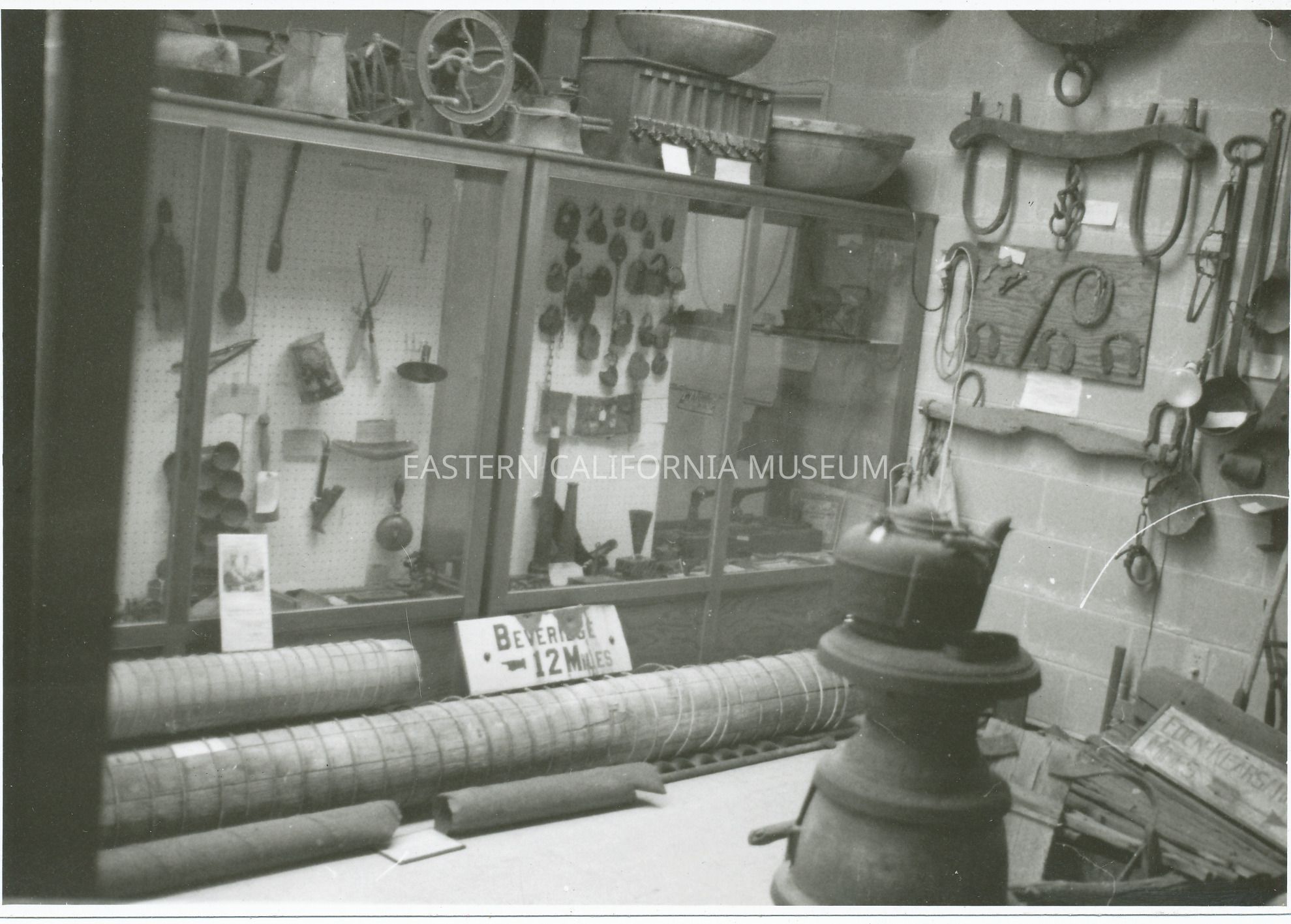 Black and white interior shot of museum. Just right of center at bottom is a potbelly stove with a cast iron tea kettle on top. On the unpainted cinder block wall is a yoke and other metal items. Two large glass cases with pegboard door behind the glass is holding metal items including wood handled meat forks and a metal pitcher. On top of cases is a grinder of some sort and a very large wood bowl.