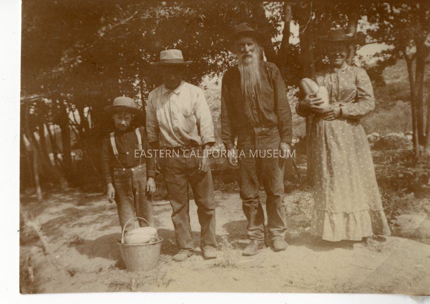 Photo of four people posing for the camera. From left to right is Allie Robinson, "Socks" a Chinaman, Mr. Lane, and Mrs. Chas Robinson. There is a large pail near Allie's feet and Mrs. Robinson is carrying something in her arms (squash? loaf of bread?). Additional information from accession record: Small picture of Mr. Lane who one time owned what is now called the "Parker Ranch." In the picture with him are (from left to right): Allie Robinson as a small boy, "Socks" an old Chinaman who always had a wonderful garden and worked with Mr. Lane on the ranch and the two raised fine vegetables, Mr. Lane, and Mrs. Chas Robinson (grandmother of Allie).