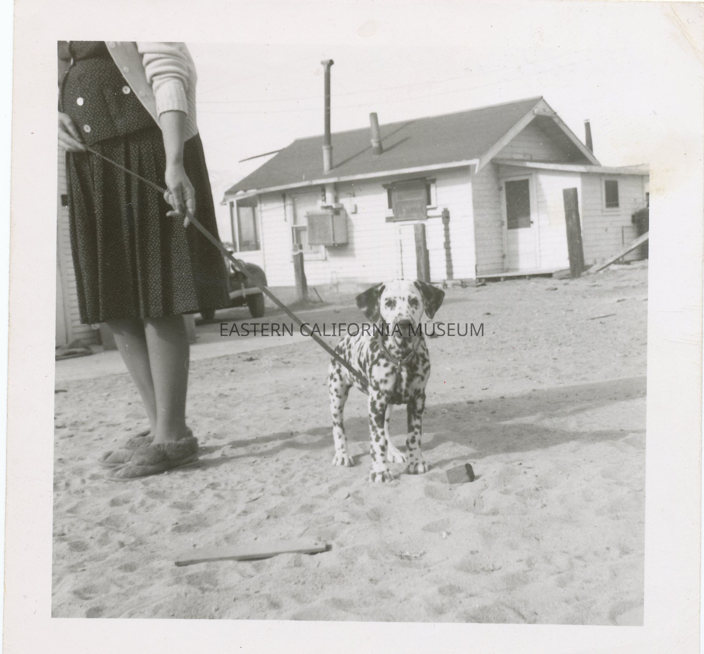 Photo of a Dalmatian dog on a leash with woman (face not in photo) identified as Shirlee Rogers holding the leash. There is a wood frame house and car in the background. Mr. and Mrs. Wathel Rogers lived in Keeler while Mr. Rogers worked for the Sierra Talc and Clay Company from 1947 through 1948.