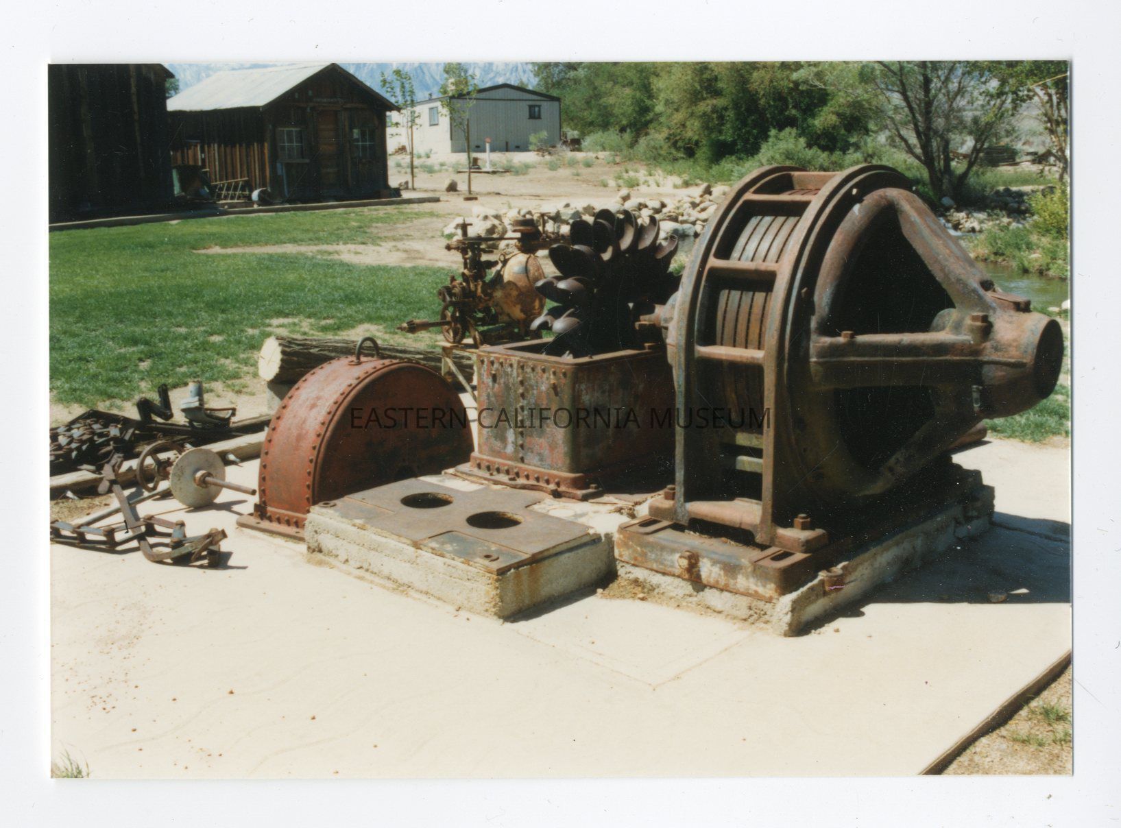 Nos. 2-8, 2-9, 2-10, 2-11. Pelton Wheel originally installed in the DWP's Division Creek Power Plant No. 1. It is not connected to the original generator. Division Creek supplied power to the electric-powered dredge that the DWP used to dig the aqueduct. Later, Division Creek power was delivered to the area which began the generation of power in Owens Valley.