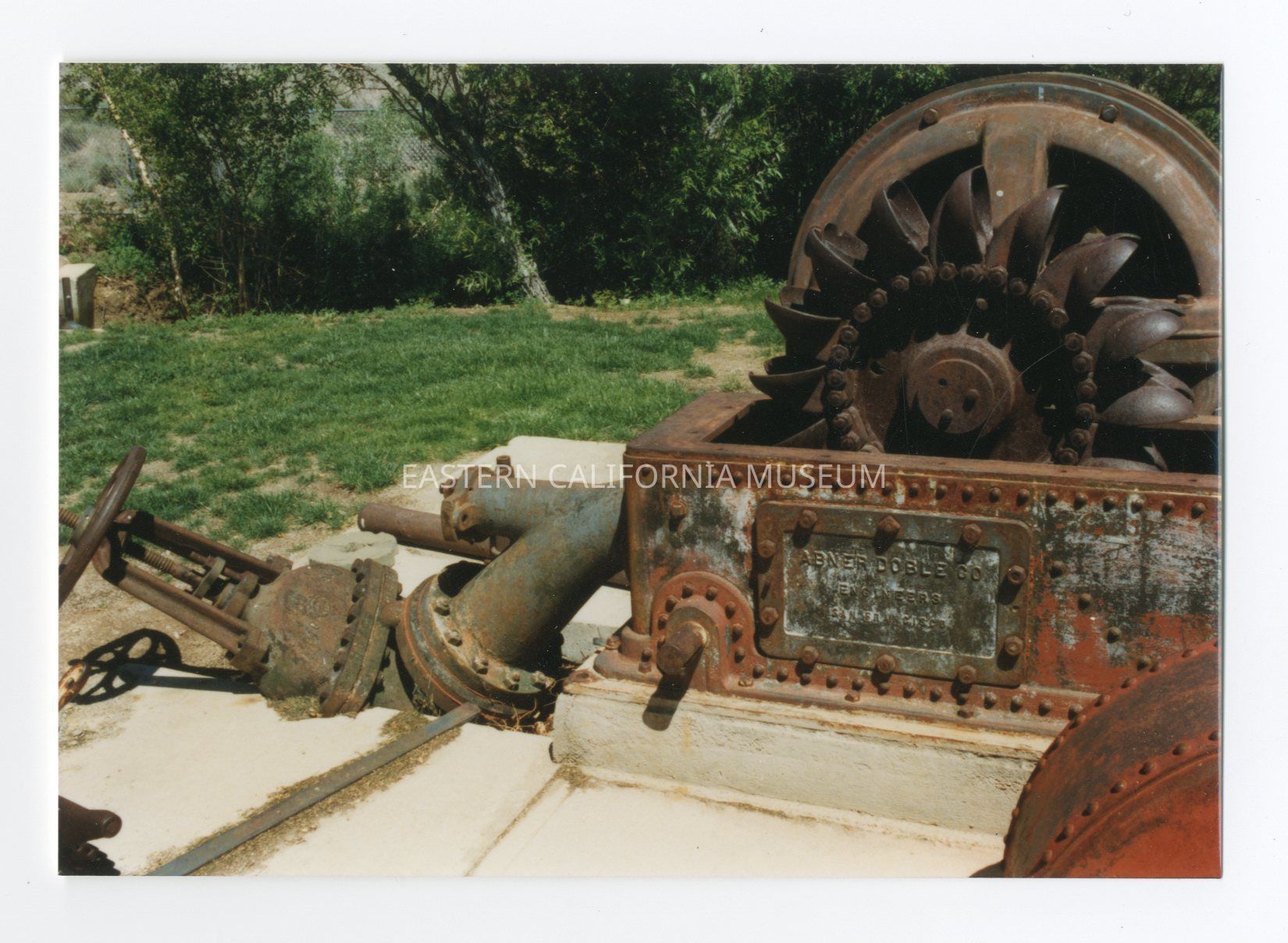 Nos. 2-8, 2-9, 2-10, 2-11. Pelton Wheel originally installed in the DWP's Division Creek Power Plant No. 1. It is not connected to the original generator. Division Creek supplied power to the electric-powered dredge that the DWP used to dig the aqueduct. Later, Division Creek power was delivered to the area which began the generation of power in Owens Valley.